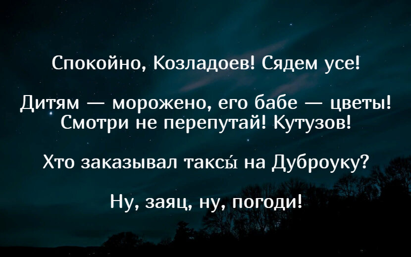 Эх! Жизнь моя — жестянка! Да ну ее в болото!Шампанское по утрам пьют или аристократы, или дегенераты.Ты мне скажи, Некрасов, ты сымал?.. или не сымал?..Я торгую кулубнику, выращенную своими собственными руками, а за взятки не то что зятя — родную дочь сотру в порошок!Тебя посодют, а ты не воруй!Будет тебе там и ванна, будет и кофа, будет и какава с чаем. Поехали к шефу!