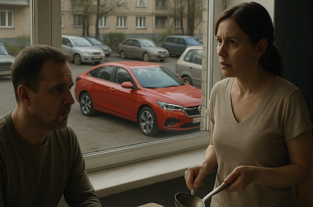 За окном, во дворе, поблёскивал свежий красный седан. Новый автомобиль резко выделялся среди стареньких машин соседей.
