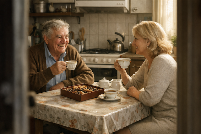 За столом сидела ухоженная светловолосая женщина в мягком трикотажном платье. Перед ней стояла чашка кофе и красивая коробка с печеньем, перевязанная лентой. Виктор Николаевич сидел напротив. Лицо у него было мягкое, расслабленное, почти счастливое. Таким я его никогда раньше не видела.