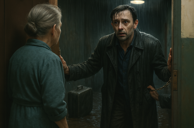 На площадке, под тусклой лампочкой, мялся мужчина в плаще, промокшем до последней нитки. С рукавов стекала вода, на полу расползалась лужа. Рядом стоял чемодан — потерянный вид, бока распухли, словно его не раз пинали. Мужчина дрожал, губы посинели, глаза… те самые, до боли знакомые, смотрели снизу вверх — виновато и жалобно.