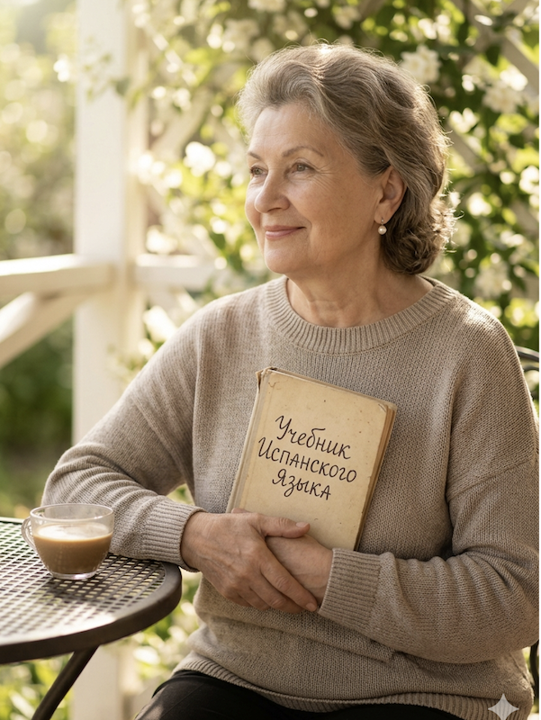 Альбина Павловна сидела на веранде своего нового, небольшого, но очень уютного домика в пригороде. Вокруг буйным цветом цвёл жасмин — его густой, сладкий аромат был именно таким, каким она его представляла в своих мечтах. В руках у неё был планшет: она увлечённо учила новые глаголы на испанском, готовясь к предстоящей поездке.