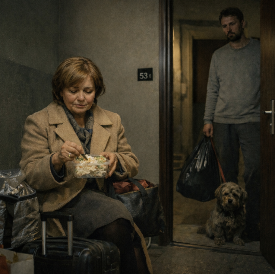 Дверь напротив была приоткрыта. В проёме стоял мужчина — высокий, в домашнем свитере и спортивных брюках. В одной руке — мусорный пакет, в другой — поводок с маленьким лохматым псом.