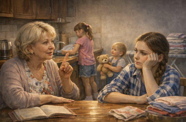 — У тебя подрастает помощница. Девочек нужно с детства приучать к дому. Иначе вырастет беспомощной! Посмотри на себя — всё умеешь, потому что я тебя с малых лет приобщала к хозяйству.