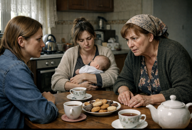 Кухня располагалась дальше всего от детской комнаты, поэтому там можно было разговаривать, не опасаясь разбудить малышей. Анна поставила чайник и достала из шкафа пачку печенья. Ольга устало опустилась на стул и крепче прижала сына к себе. Светлана Ивановна села напротив и сложила руки на столе.