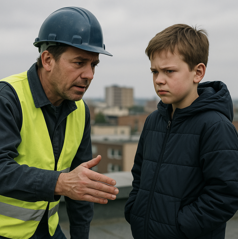 — Ух ты! Маленький совсем… — произнёс мужчина и расстегнул сумку, которую держал. — Мы здесь крышу поправляем — меряем, считаем, сколько материала потребуется… Хочешь, покажу прибор? Смотри, это лазерный дальномер.
