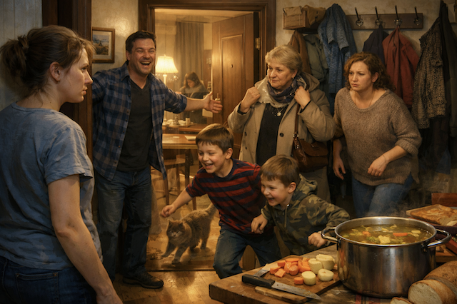 В квартиру шумной толпой, словно большая шумная компания, ввалились родственники мужа. Свекровь, Валентина Петровна, статная женщина с плотно сжатыми губами, сразу принялась отряхивать несуществующую пыль с пальто. Следом протиснулась золовка Ольга — младшая сестра Андрея, вечно уставшая мама двоих детей в просторном растянутом свитере. За ней вбежали её сыновья-погодки: девятилетний Никита и восьмилетний Максим, которые с громким гиканьем помчались в гостиную, по дороге чуть не сбив с ног домашнего кота.
