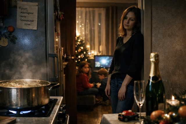 Утром тридцать первого она отвела детей к соседке, тёте Вере, а сама помчалась в магазин. Люди толкались, спорили у прилавков, хватали последние мандарины и кур. Алина лавировала между тележками — и ей вдруг стало легче. В шуме, в суете, в отсутствии времени на раздумья.