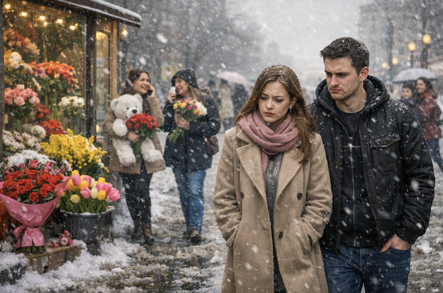 Восьмое марта встретило странной погодой. Сугробы, которые давно обязаны были растаять, продолжали сыпаться с неба, превращая тротуары в серую кашу. Ни малейшего ощущения весны не витало в воздухе, но витрины лавок всё равно пестрели букетами — тюльпанами, розами и ветками мимозы.