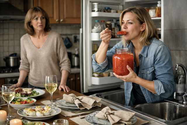 Ольга нашла банку мгновенно. Открутила крышку, взяла обычную столовую ложку и зачерпнула густую, блестящую икру. Стоя прямо у раковины, она ела спокойно, методично, ложка за ложкой, будто это была её собственная кухня после долгого рабочего дня.
