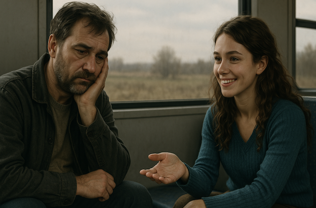 Леонид полулежал на жёстком сиденье электрички, опершись щекой на ладонь, и рассеянно наблюдал, как в окне сменяются унылые поля, куцые кусты, редкие перелески — всё однообразное, серое, будто нарочно подстроенное под его состояние. Казалось, мир вокруг решил подыграть его хандре.