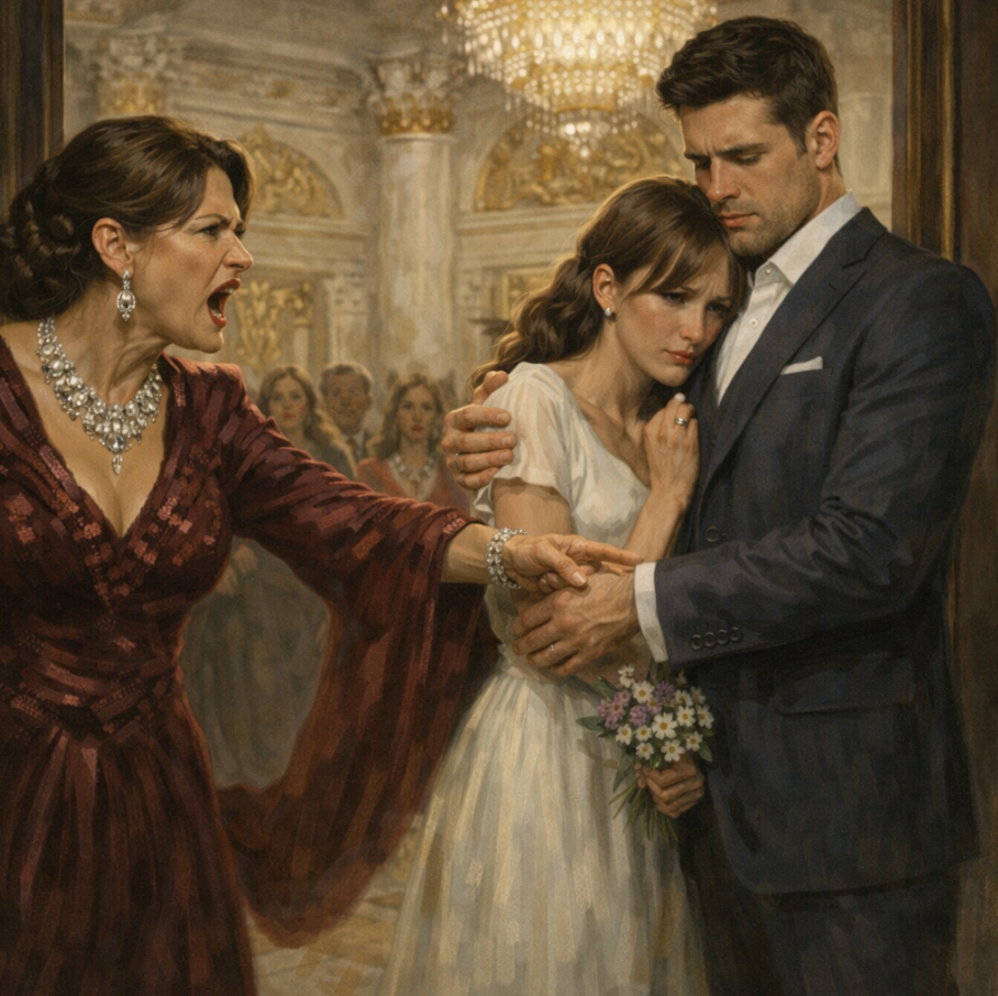 Она встала в дверях зала, раскинув руки, словно страж, не пускающий в запретную зону. На ней было тёмно-бордовое платье, сшитое в Европе по индивидуальному заказу, а на шее переливалось украшение, цена которого могла бы перекрыть стоимость всей этой свадьбы и ещё пары квартир. Её лицо, обычно безупречно холодное и отстранённое, сейчас искажала неподдельная ярость.