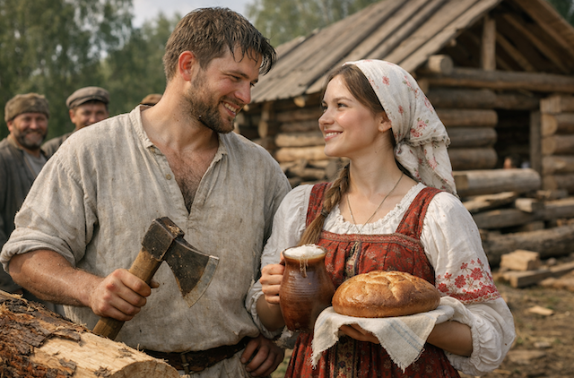 Степан отведал угощение и вновь взялся за дело — щепа летела во все стороны. А Дарья отошла в сторонку, прижимая к груди вышитое полотенце — часть приданого. Ночами при свете лучины она вышивала, не щадя глаз, мечтая о будущей жизни. Под иглой рождались птицы и колосья — знаки любви и достатка.