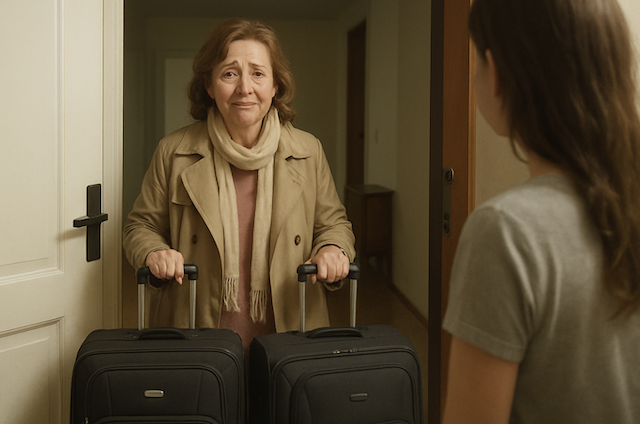 Она стояла на пороге, окружённая двумя огромными чемоданами, как туристка, прилетевшая в отпуск премиум-класса. В её лице было что-то от актрисы, вышедшей на поклон после спектакля-мелодрамы: губы дрожат, взгляд страдальческий, но вот-вот расплывётся в торжествующую улыбку.