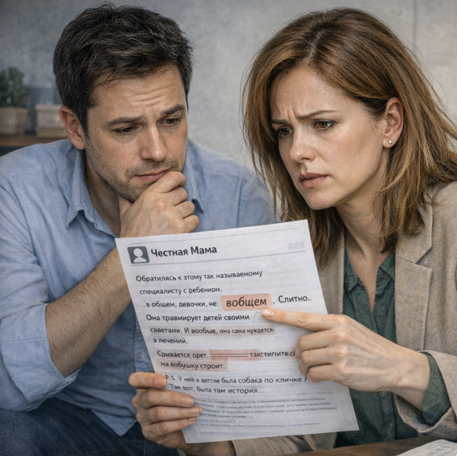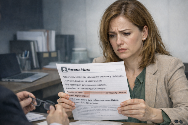 Перед ней положили распечатанный скриншот с подробным отзывом о её работе. Этот отзыв был написан будто бы недовольным клиентом с ником «Честная Мама».