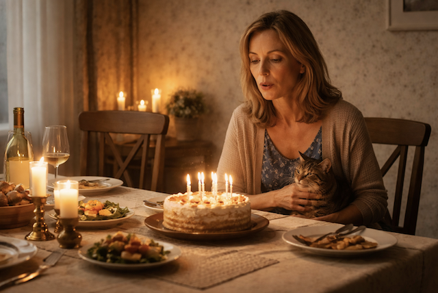 Марина одна погасила огоньки на праздничном пироге. Накануне она сервировала ужин на четверых, расставила бокалы, подожгла свечи и с удовлетворением оглядела стол.