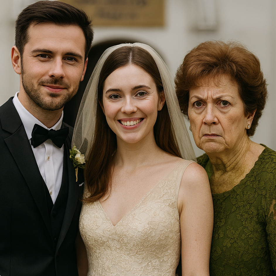 Нейросети 2025 года работали безупречно: фактура кружева сохранилась, тени естественные. Казалось, что теща действительно явилась в костюме лягушачьей королевы. На фоне светлой пары она выглядела как роскошная, нарядная жабища, выползшая испортить праздник.