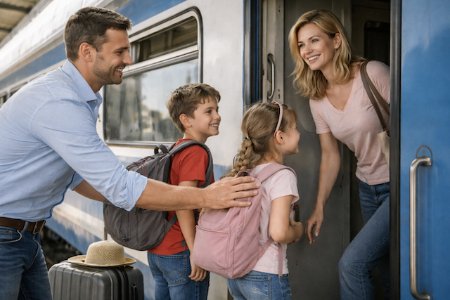 Он сошёл на перрон и исчез среди пассажиров. Ирина, измученная бессонной ночью и дорогой, прилегла, слушая, как дети спорят у окна. Она не заметила, как Андрей прошёл вдоль состава и поднялся в другой вагон, через несколько от них. В купе его ожидала молодая женщина в лёгком платье. Он обнял её — и с лица исчезло напряжение, уступив место оживлённой улыбке.