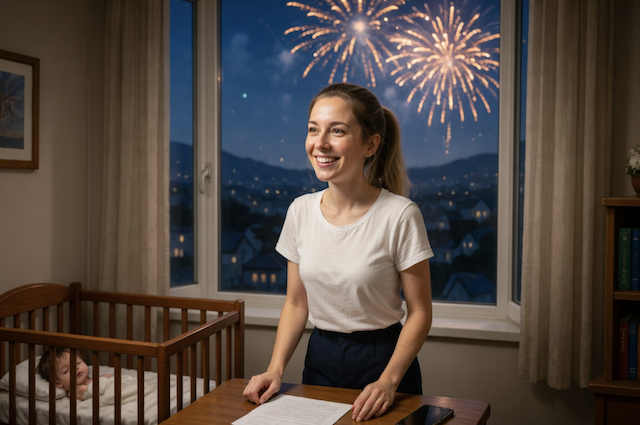 К десяти часам стол был полностью накрыт. Хрустальная посуда блестела под светом праздничных гирлянд, шампанское охлаждалось в ведёрке со льдом. Пришли родственники — сестра свекрови с супругом и несколько соседей. Ольга надела своё единственное праздничное платье, которое теперь слегка висело на ней из-за постоянного напряжения и усталости, и сидела на краю стола, придерживая сонного Артёма.