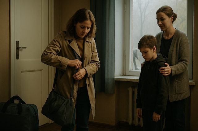 Сумка с вещами стояла у двери, застёгнутая — словно финальный штрих перед дорогой. Марина нервно поправляла ремешок, бросая короткие взгляды на сестру и сына. В прихожей пахло сыростью: за окном накрапывал дождь, а дворник сгребал к обочине мокрые листья. Уезжать Марина не хотела, но объяснять это десятилетнему Илье не имело смысла. Он стоял молча, упрямо глядя в пол. Ольга старалась казаться спокойной, хотя внутри всё переворачивалось — теперь Илья будет жить у неё.