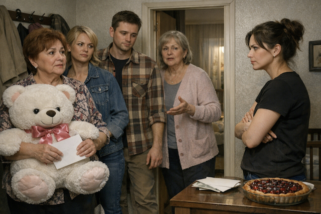 Галина Петровна смущённо моргнула, прижимая к себе огромного плюшевого медведя с нелепым шёлковым бантом на шее.