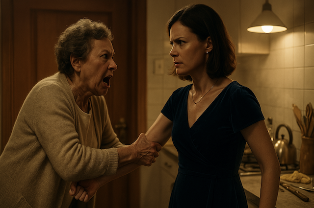 Свекровь резко взяла её под локоть и потащила на кухню. Дверь захлопнулась, как крышка рояля.