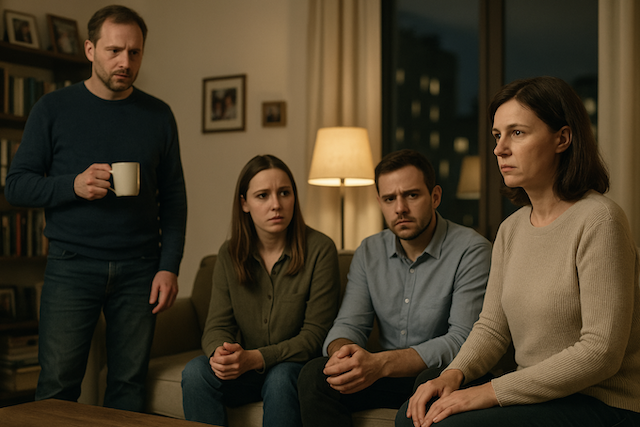 В комнате будто выключили звук. В воздухе повисла тяжёлая пауза, словно слова Марины густым слоем легли на стены и мебель. Её муж, Антон, застыл у журнального столика с кружкой чая. Костяшки пальцев, сжимающих ручку, стали бледными. На старом, немного потерявшем вид диване сидели его сестра Лада и её муж Роман, оба с лицами, на которых сплелись удивление и обида, кое-как прикрытая натянутой вежливостью.