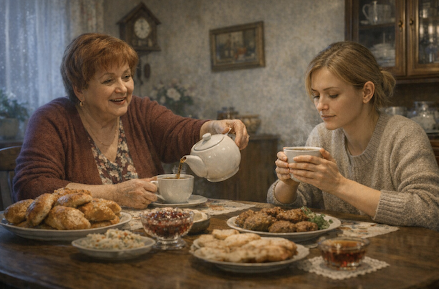 Ольга молча кивнула, согревая ладони о горячую чашку. В квартире Валентины Петровны всегда тянуло прохладой – она берегла отопление, зато на столе неизменно вырастали горы пирогов, домашних котлет и салатов. Словно Ольга заглянула не на чай, а на большой семейный праздник.