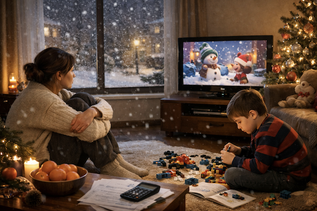 В комнате стоял аромат цитрусов, хвои и домашнего тепла. Марина, подтянув ноги к груди, устроилась на полу напротив телевизора, где беззаботно мельтешили нарисованные персонажи.