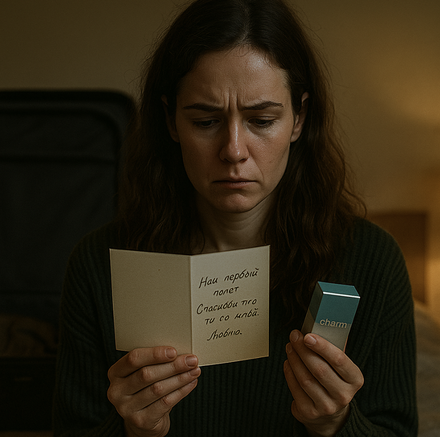 Дома она проверила чемодан мужа. В боковом кармане лежала коробка с духами и открытка:
