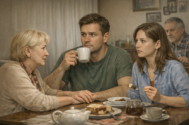 Игорь застыл с кружкой, не донесённой до губ. Марина, его супруга, тоже замерла — кусок пирога так и остался висеть на вилке.