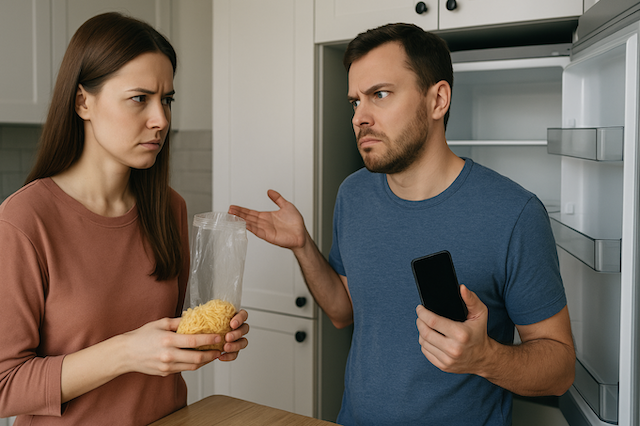 Но вот стою я посреди кухни, держу в руках остатки лапши, а мой муж — Никита — смотрит так, будто я только что продала содержимое холодильника на чёрном рынке.