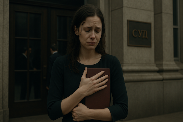 Лера стояла у входа в здание суда, прижимая к груди тонкую папку с бумагами.