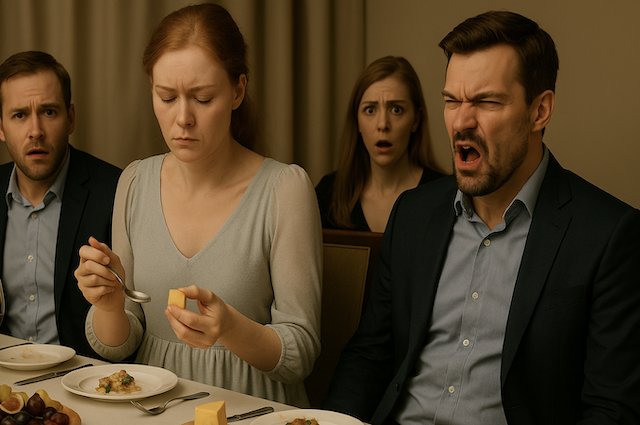 Екатерина застыла с ложкой в руке, словно превратившись в хрупкую статую из стыда и неверия. Кусочек сыра, аккуратно зажатый между пальцами, так и не долетел до тарелки. Она, вся лёгкая и прозрачная, будто соткана из инея, сидела напротив мужа и ощущала, как десятки взглядов — жалостливых, испуганных, укоряющих — впиваются в неё. Сердце подступило к горлу, дыхание стало рваным.