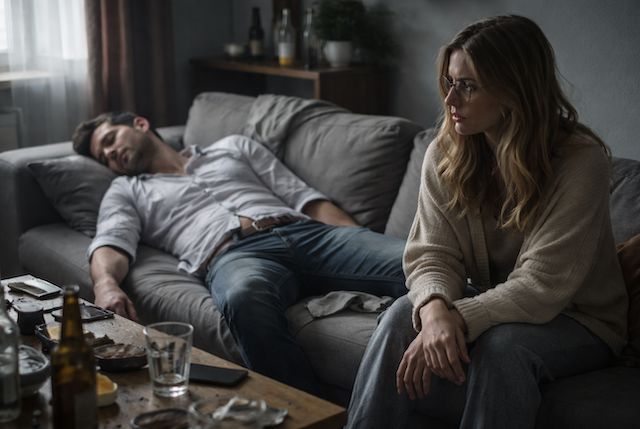 Наташа сидела на краю дивана и смотрела на него так, будто видела впервые. Он валялся, свернувшись, тихо сопя. От него тянуло кислым запахом алкоголя. Одежда была та же, в которой он завалился ночью: помятая рубашка, джинсы, расстёгнутый ремень.