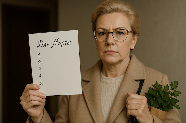 В конверте лежал лист с пятью установками. Бумага была плотная, как визитка, гладкая и белая, пропитанная чужим ароматом духов. Имя получательницы — «Для Марты» — выведено аккуратным, уверенным почерком, с горделивым завитком в конце, словно сама подпись служила доводом. Марта держала этот конверт — лёгкий прямоугольник, но тяжёлый, как вердикт, — и размышляла, что утро начиналось запахом ванильных оладий и мерным шепотом дождя, а теперь стало слишком значительным.