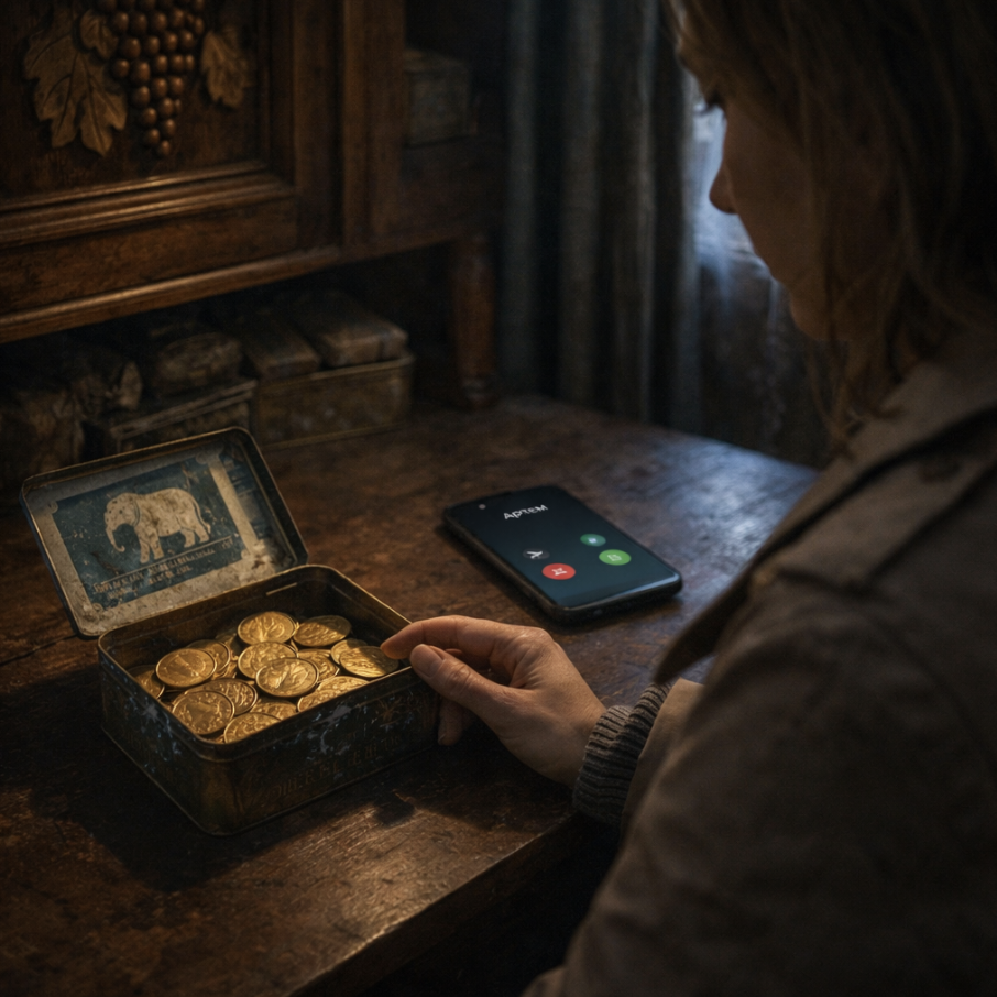 Она быстро сгребла монеты обратно в коробку, вернула её в буфет и задвинула панель. В дверь постучали. Не робко, как соседка за солью, и не нагло, как полиция. Стук был спокойный, уверенный. Три чётких удара.