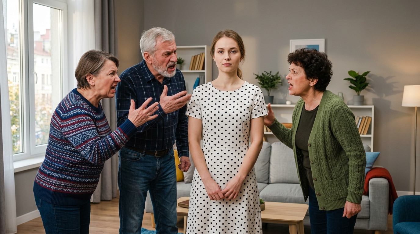 Галина Ивановна — в своей неизменной кофте цвета морской волны, с пакетами, доверху набитыми банками с соленьями и пирогами. Тетя Тетяна — старшая сестра свекрови, громогласная, массивная, с крупными золотыми серьгами и готовым мнением по любому вопросу. Игорь — её супруг, невысокий, молчаливый, будто всё время за что‑то извиняющийся: то перед женой, то перед судьбой.