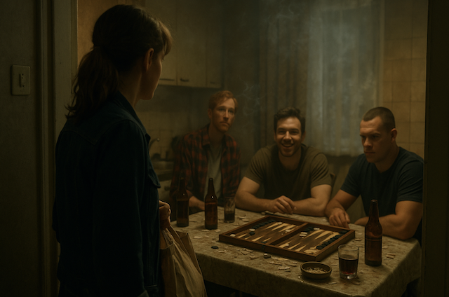 Когда Лида вошла в квартиру, она сперва подумала, что перепутала этаж. Воздух был насыщен табачным дымом, из кухни слышались резкие реплики и громкий смех, а по столу барабанили костяшки нард.