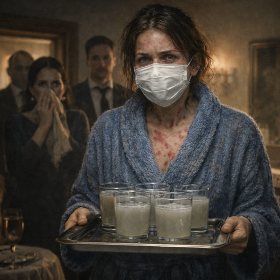 Она зашла на кухню. Яркий свет резал глаза. На столе лежали старые медицинские маски и бутылёк антисептика. Рядом — застиранный махровый халат, уютный и совершенно неподходящий для «образа».