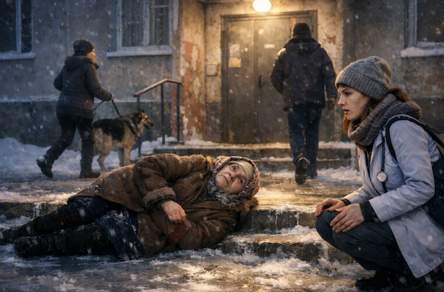 Марина шла после дежурства, когда заметила у соседнего подъезда тётю Валю. Пожилая женщина растянулась на заледеневших ступенях, неловко поджав под себя руку, и глядела в небо так, будто уже приняла мысль, что это последнее, что ей доведётся увидеть.