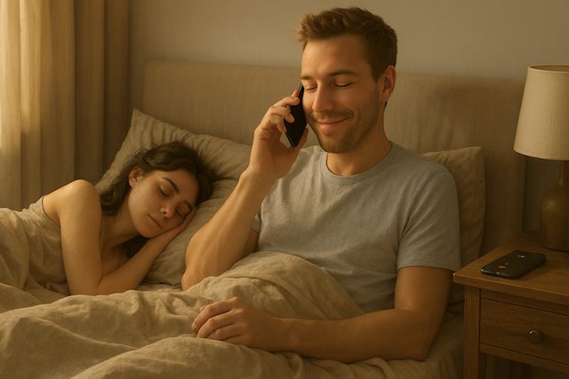 Он поднялся и ушёл в ванную, не заметив выражения жены. Когда вернулся, Катя всё ещё сидела на кровати, но лицо стало уставшим и отстранённым.