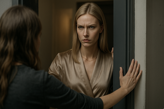 На пороге — незнакомая ухоженная блондинка лет тридцати в дорогом шёлковом халате, с тонкой цепочкой на шее. Взгляд холодный и высокомерный.