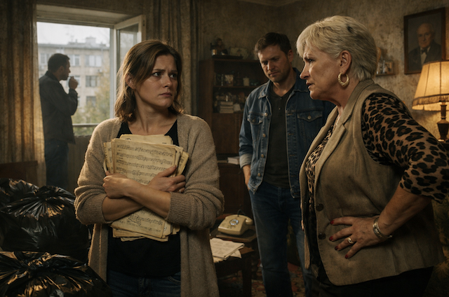 Марина застыла в центре комнаты, сжимая охапку выцветших нотных тетрадей. Пальцы дрожали не от веса — от того, с какой беспардонностью Вера Степановна, мать её мужа, запихивала вещи в огромные чёрные мешки.