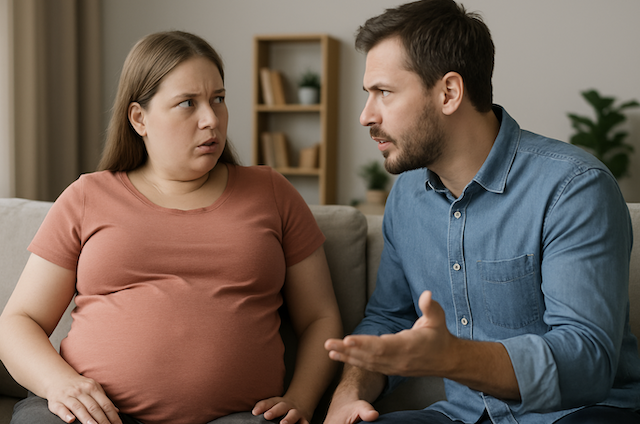 Когда живот стал заметен, когда появились отёки и слабость, забота мужа обернулась раздражением. Ему перестали нравиться перемены во внешности жены. Метаморфозы казались ему отталкивающими, и он спрятался за грубоватый юмор.