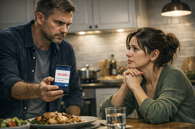— Объясни, пожалуйста, почему с нашего счёта списали тридцать пять тысяч в магазине техники. Мы ведь собирались копить на отпуск.