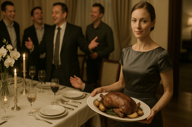 Гул голосов и тонкий перезвон бокалов разливались по дому, как медленный, вязкий туман. Запах запечённой птицы с карамелизированными яблоками наполнял пространство теплом, под которым скрывалась ледяная усталость. Всё — как всегда. Всё — как по нотам. Я в той самой роли, которой меня научили годами: тихая, незаметная, удобная, правильно улыбающаяся хозяйка, созданная подчеркивать силу мужа, а не иметь собственную.