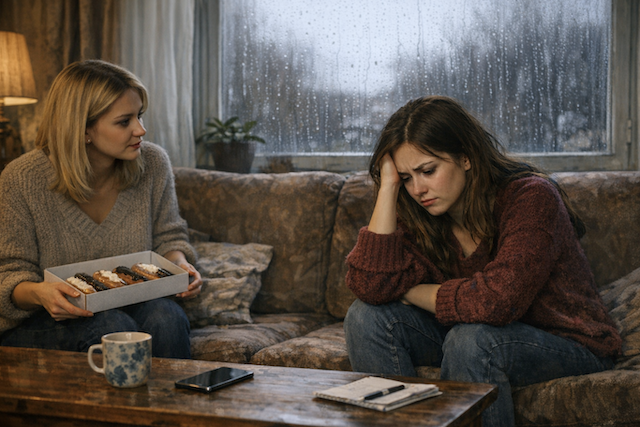 — И как он объяснил, почему не пришёл? — Лера поставила перед сестрой коробку с эклерами и опустилась рядом.