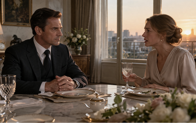 Александр аккуратно положил вилку, промокнул губы салфеткой и посмотрел на жену. В его строгих глазах не было ни тепла заката, ни нежности — только холодный расчёт, с которым он обычно вёл важные деловые встречи.