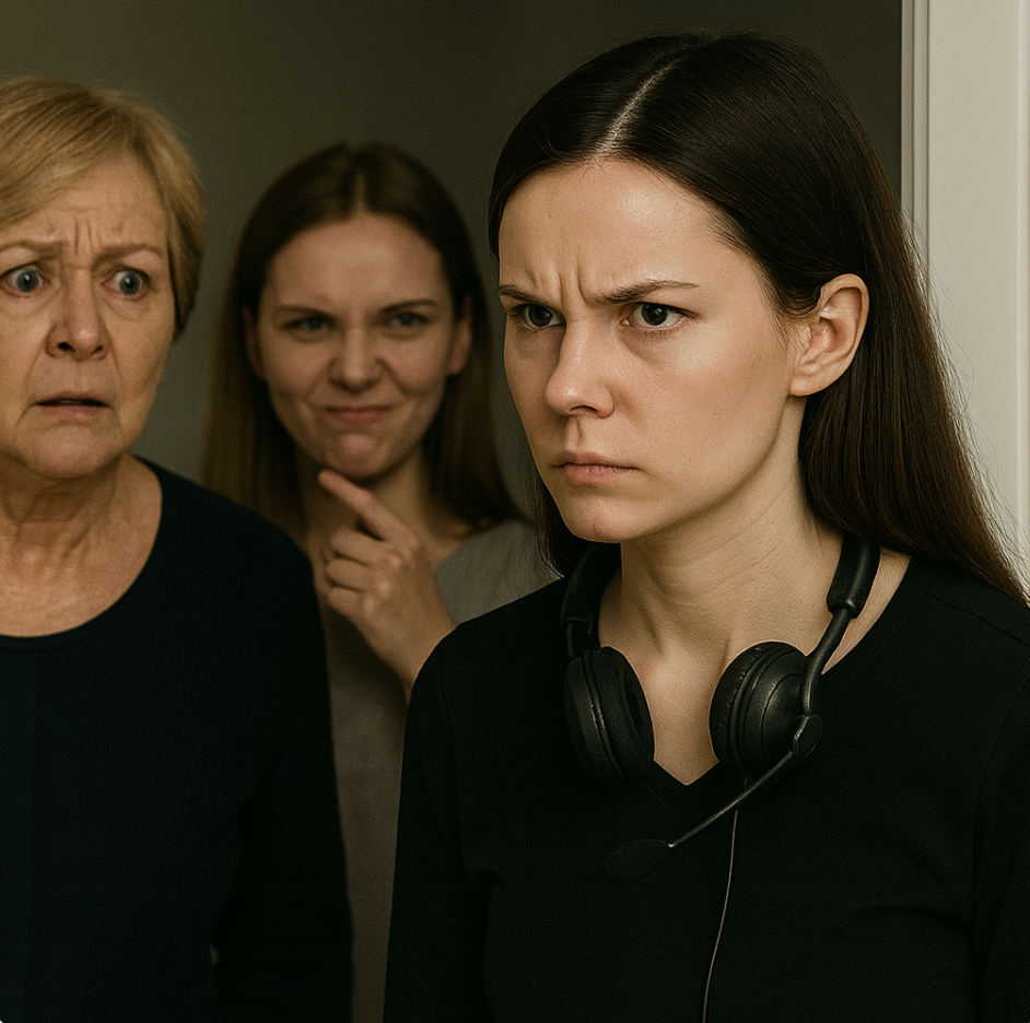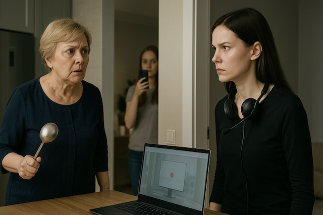 Из гостиной донёсся шаркающий звук тапок. Золовка Алина выглянула из-за маминой спины, держа телефон с включённым эфиром для своих подруг.