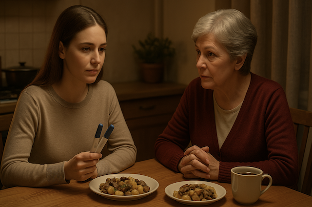 Вечером Лариса зашла в аптеку и купила пару тестов. Дома её встретила Нина Степановна, мать мужа, уже накрывшая стол: ароматный чай и тушёная картошка с грибами.